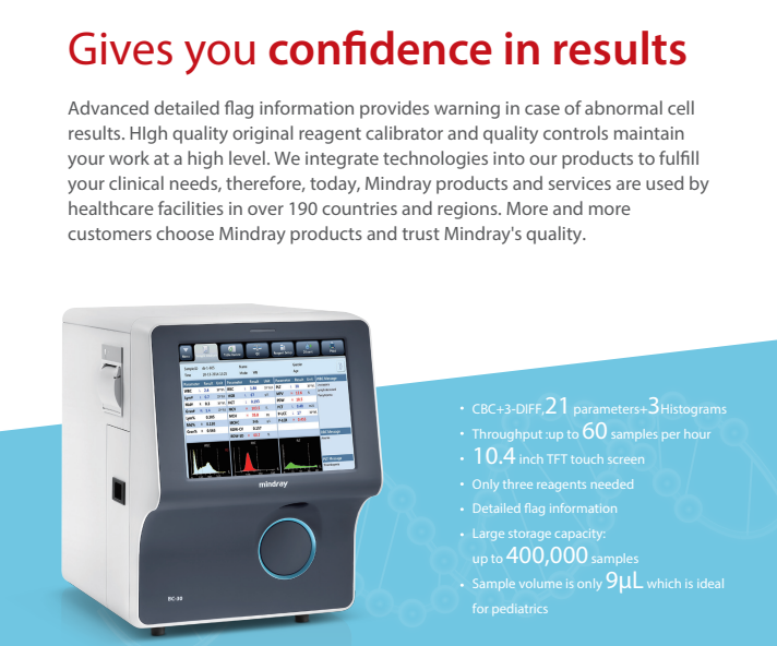 The BC-30s is a compact yet powerful 3-part differential hematology analyzer. With a large 10.4-inch touch screen and efficient workflow, it brings confidence and convenience to smaller laboratories and clinics, setting a new standard for compact diagnostics.