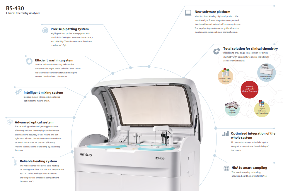 The BS-430 is a versatile benchtop chemistry analyzer designed for mid-sized laboratories. With a constant throughput of 420 tests per hour and advanced features like HbA1c testing and clot detection, it provides reliable and efficient performance for routine testing.
