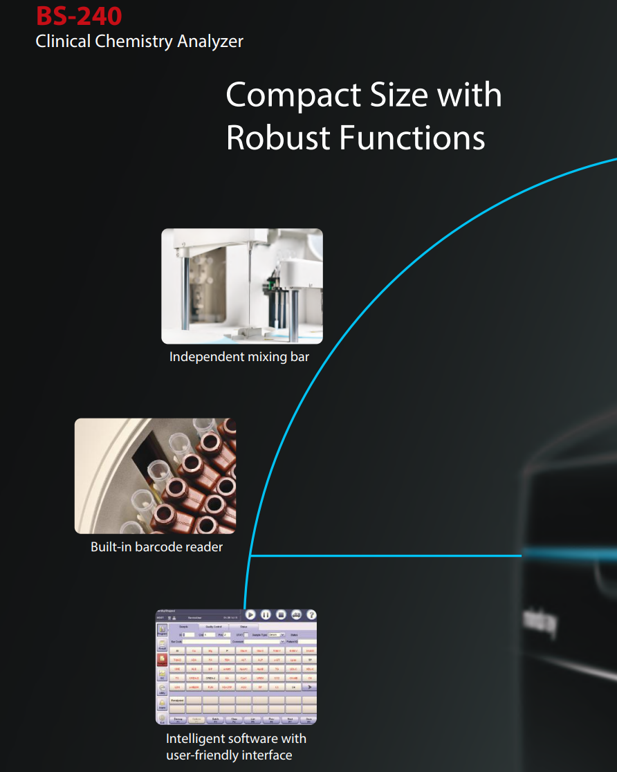 The BS-240 is a compact, multi-functional benchtop chemistry analyzer with a throughput of 200 tests per hour. Designed for small laboratories, it offers big-system features like a washing station and HbA1c capability in a small footprint.